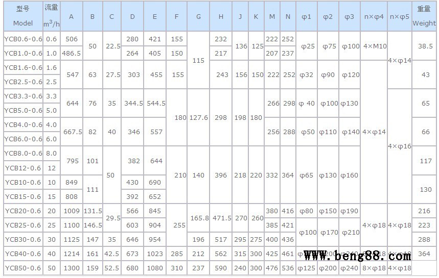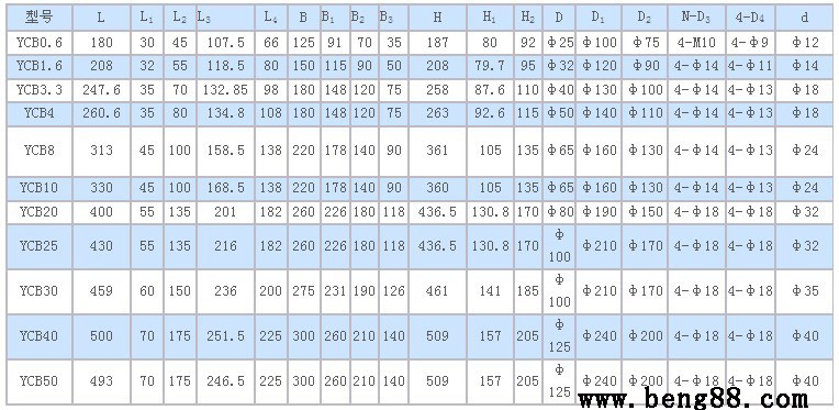 YCB型齒輪泵外形及安裝尺寸的性能參數(shù),是在介質(zhì)粘度4×10-3m2/s(40cSt)時(shí)確定的。YCB型齒輪泵外形及安裝尺寸性能參數(shù)表中給出的參數(shù)值適用于介質(zhì)粘度1×10-5~8×10-5m2/s(10~80cSt)范圍內(nèi),超出這個(gè)范圍則根據(jù)用戶提出的性能參數(shù)要求另行確定。
